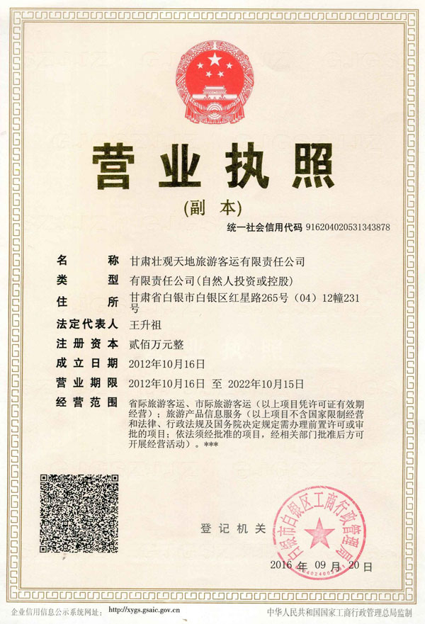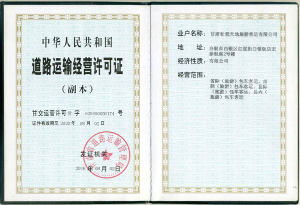 甘肅壯觀天地旅游客運(yùn)有限責(zé)任公司成立于2012年10月,注冊(cè)資金200萬(wàn)元,是經(jīng)甘肅省交通廳道路運(yùn)輸管理局批準(zhǔn),具備。ㄊ校╇H旅游包車服務(wù)的旅游客運(yùn)專業(yè)運(yùn)輸企業(yè)。